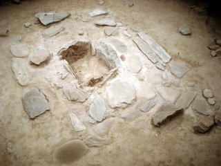 中央の炉跡は、4個の結晶片岩で長方形に築かれ、内法は約55p×44cm、深さ約36pと説明されている。
