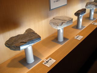 石の展示品です! 石墨片岩(黒色片岩ともいい、なでると黒く汚れ茶色は鉄のさびと記されている。